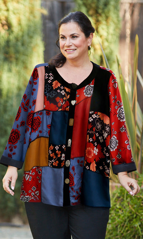 Add a bold splash of color and creativity to your wardrobe with the Pearsall Patchwork Blouse! Designed for comfort and effortless style, this unique top features an eclectic mix of vibrant rayon panels with playful prints and abstract motifs that express individuality with every stitch.