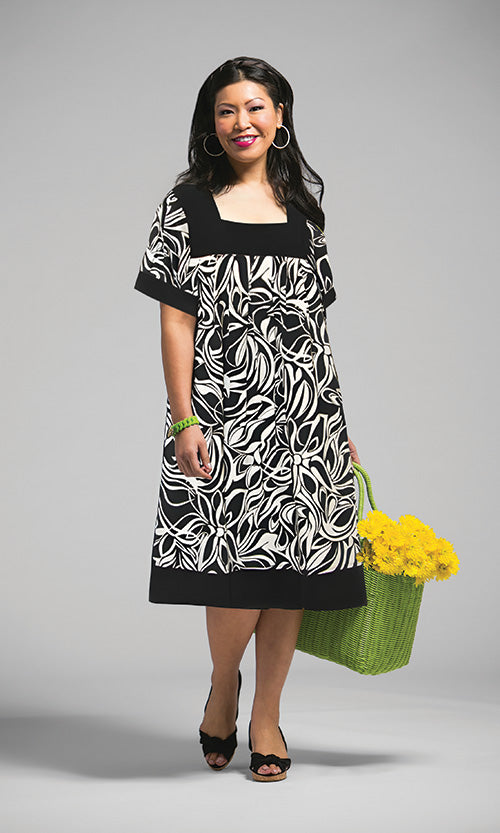 This dress blends modern lines with feminine elegance to elevate your everyday wardrobe. The contrasting black borders at the neckline, sleeves, and hem add structure and polish, making it easy to dress up or down for any occasion.